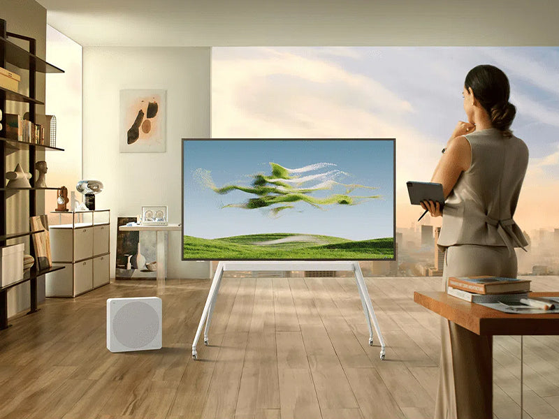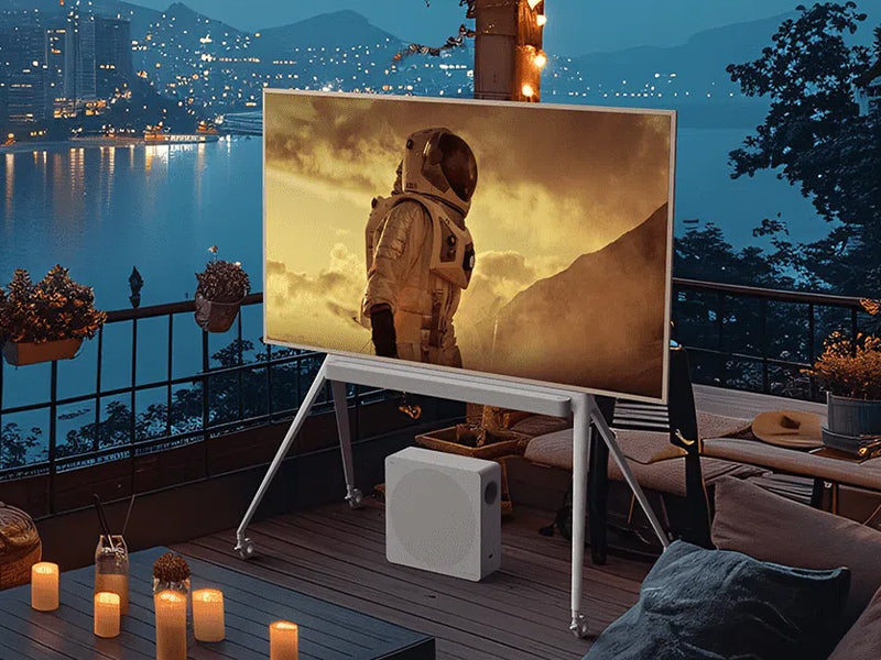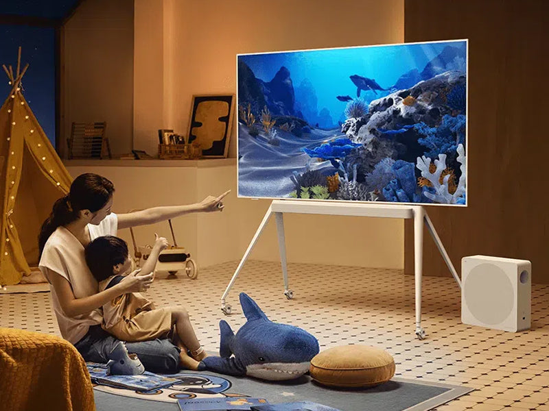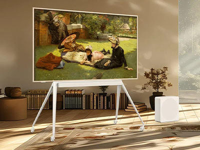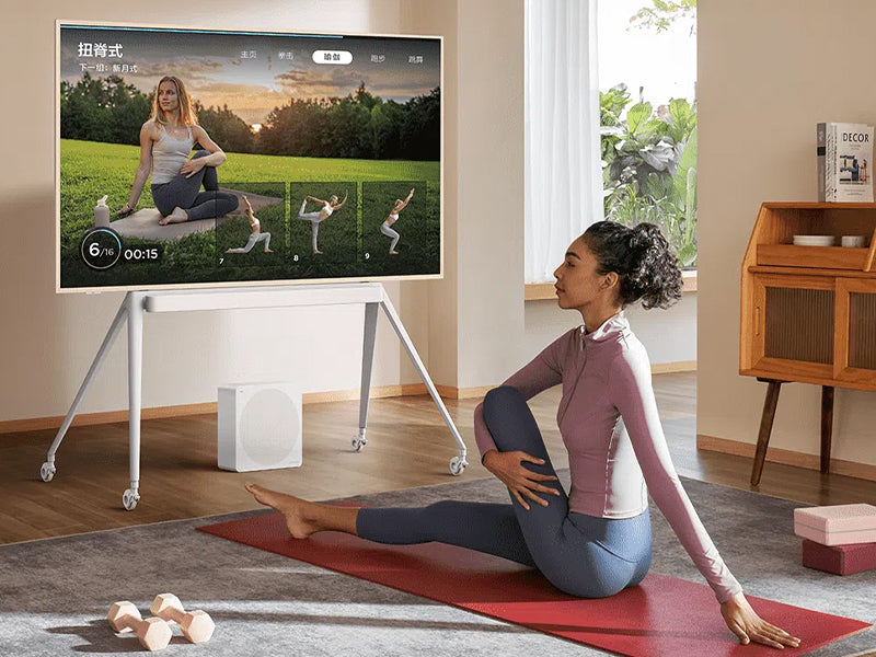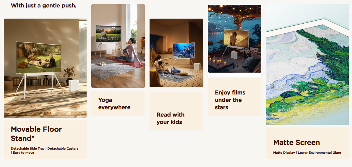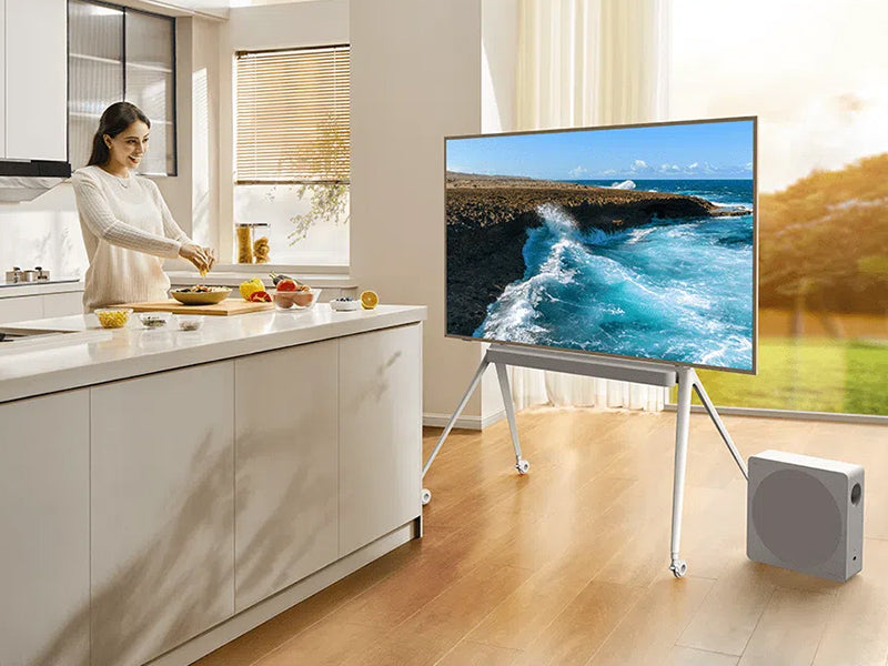 Equipped with an easel-style floor stand and wheels, your TV glides freely at home, transforming every corner into your personal cinema for audiovisual enjoyment.