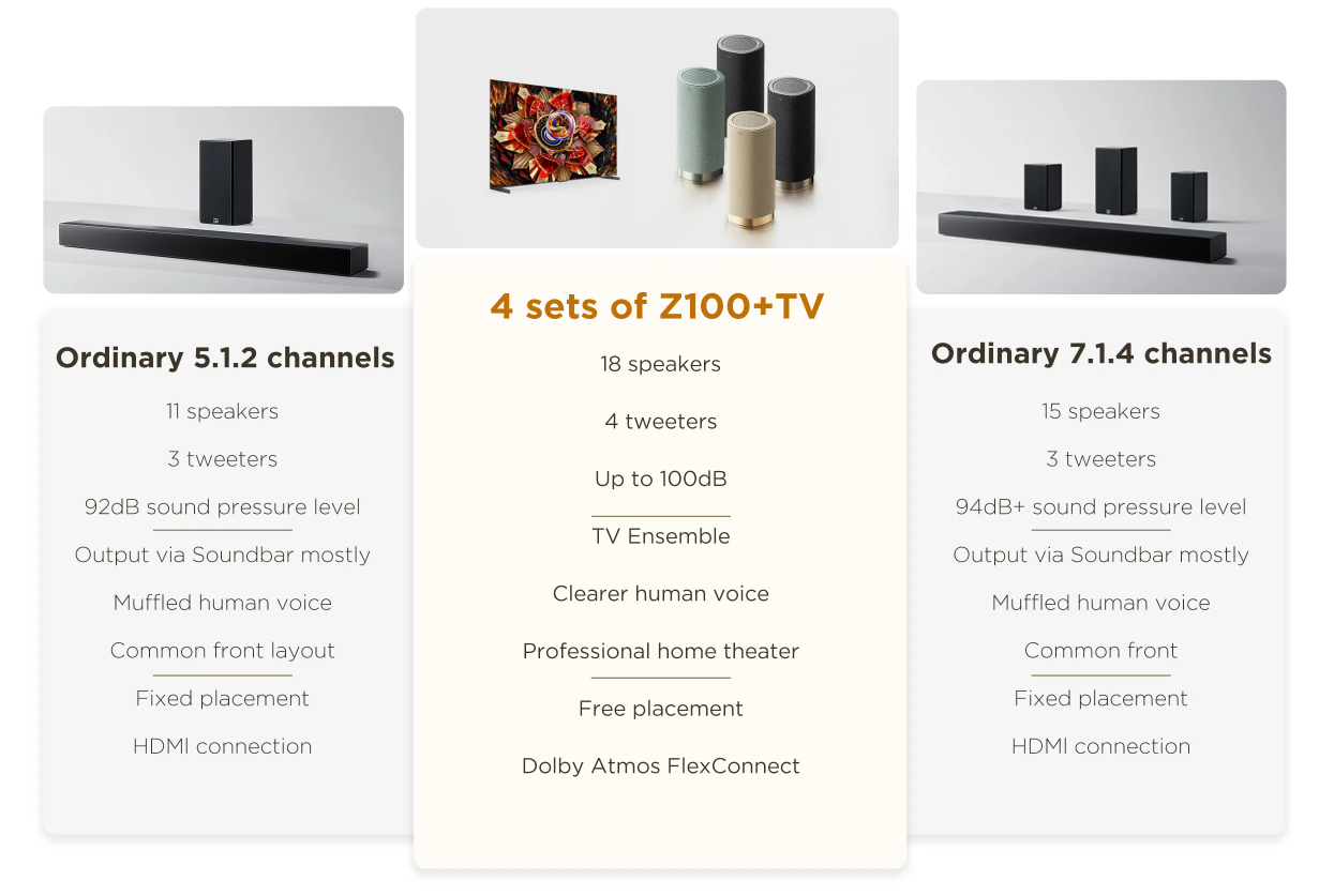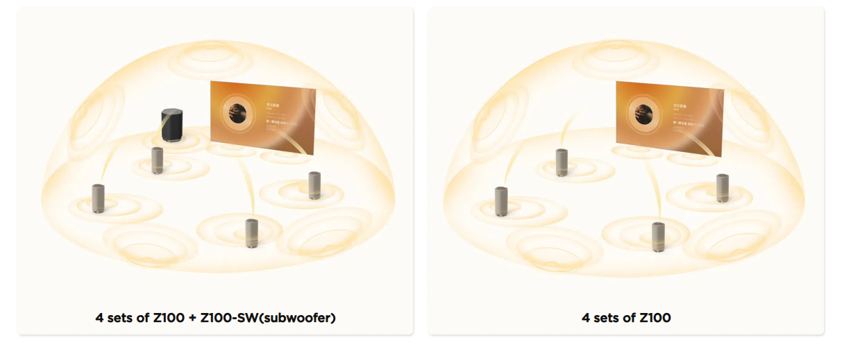 The sound pressure level of a single Z100 can reach the ultra-high sound pressure level of an entire sound bar system, delivering a more immersive and powerful sound, enhanced spatial audio transparency, and an expanded sound stage