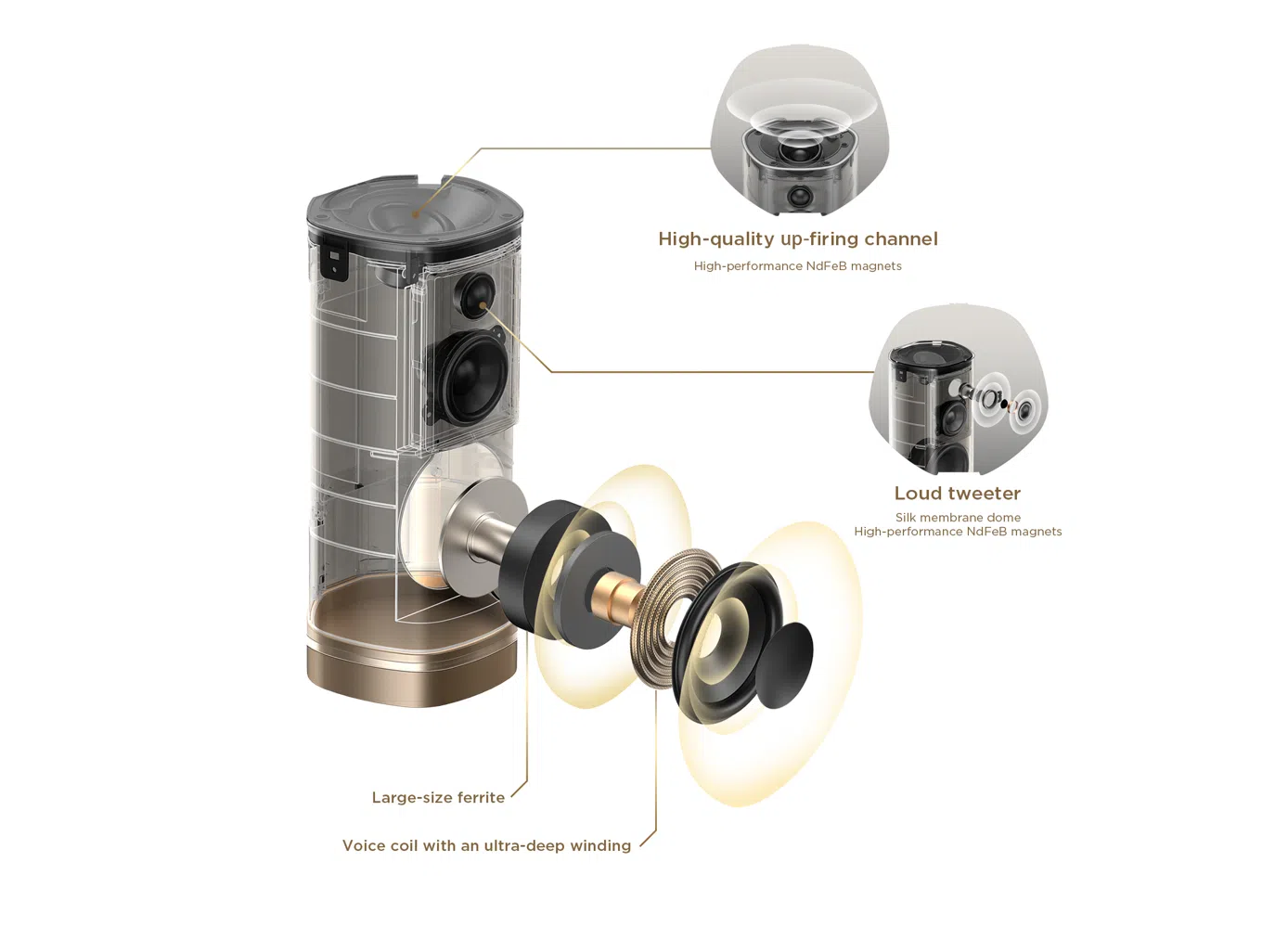 The optional independent subwoofer features a deep star gray appearance and utilizes larger ferrite magnets and CONEX elastic wave materials inside, delivering strong and rich high-fidelity bass for an enhanced immersive experience.